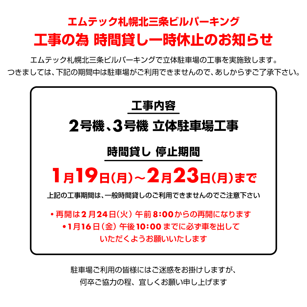 時間貸し駐車場は、上記の休業日程とは異なります。各駐車場の休業日に つきましては、恐れ入りますが直接各店舗 又は 当ホームページの駐車場情報ページにてご確認ください。